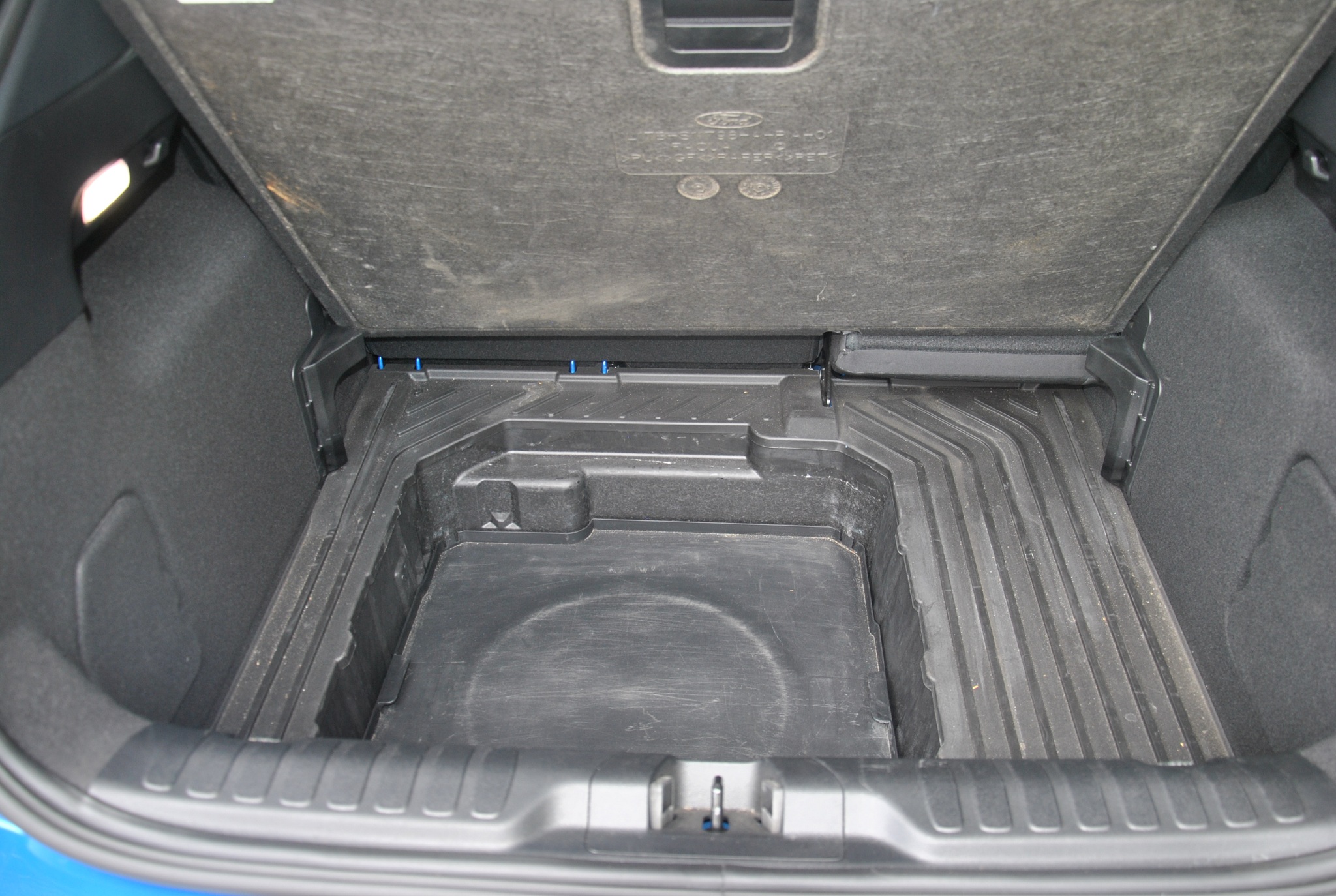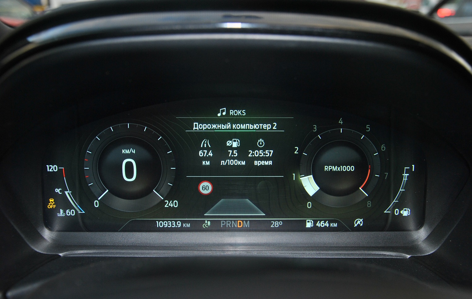 В варианте ST-Line Plus отделку разбавляют вставки «под карбон» и контрастные красные швы. Руль со скошенным снизу ободом обшит перфорированной кожей, а педали и пороги украшены металлическими накладками. Нежно-голубая диодная подсветка приятная для глаз. В салоне, пожалуй, лучше всего проявляется родство с Fiesta – у хетчбэка позаимствовали переднюю панель и переключатели. Показания приборов выведены на 12,3-дюймовый дисплей, причем его графика меняется, в зависимости от выбранного режима езды.
